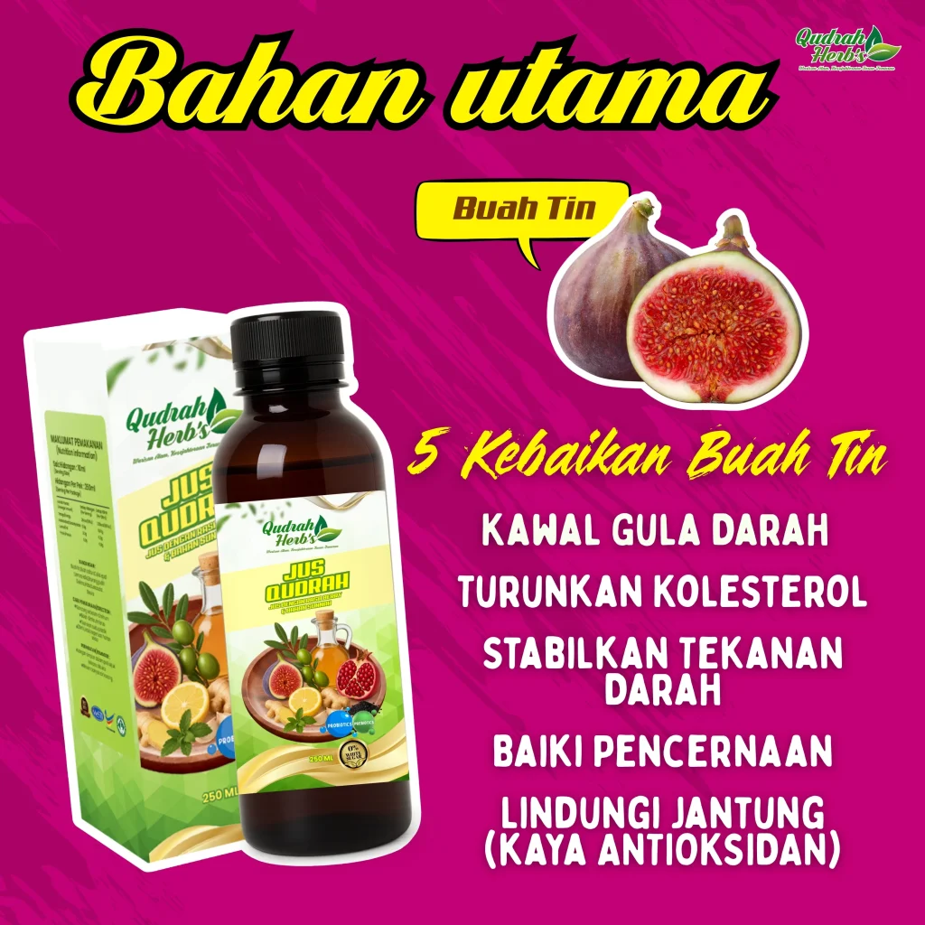 Jus Qudrah memberikan pelbagai manfaat kesihatan seperti membantu mengawal tekanan darah & gula, menyokong kesihatan jantung, serta membekalkan nutrien semula jadi dari buah tin, zaitun, delima dan habbatus sauda. Diperkaya dengan rasa berry yang menyegarkan, ia bukan sahaja berkhasiat malah sedap diminum setiap hari.